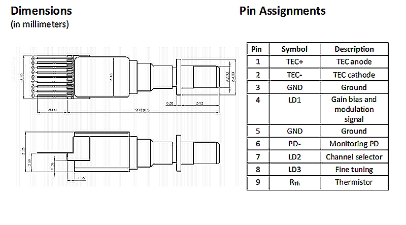 The TLDX155 series Transmitter Optical Sub-Assembly (TOSA) integrates a V-cavity edge-emitting tunable laser, a power monitoring photodiode, an isolator, and a TEC controller. The connector type can be chosen from LC, SC or fiber-pigtail with FC/PC or FC/APC connector. It can provide up to 40 channels at 100GHz spacing or 80 channels at 50GHz spacing in C- or L- band (other wavelength bands available on request). The size of the 9-pin TOSA is only a small fraction of that of the conventional butterfly package