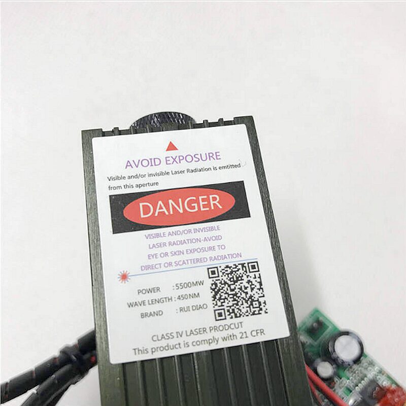 Key features: A high-power 5.5W diode laser equipped with a tunable blue laser module, featuring a 450nm wavelength and TTL driver, enabling high precision in laser cutting and engraving. It includes a heatsink and fan cooling system, a glass lens, operates on AC/DC 12V, and offers focusing accuracy less than 0.5mm for industrial applications.