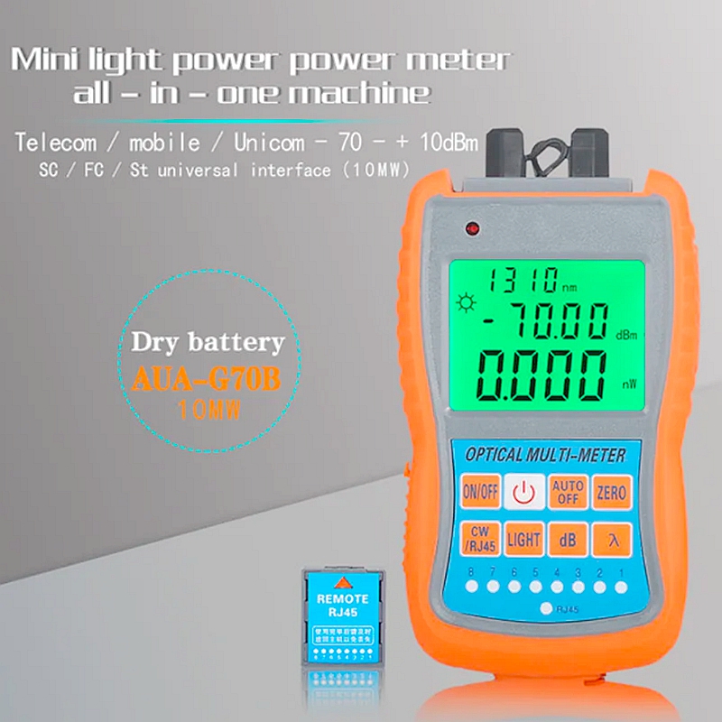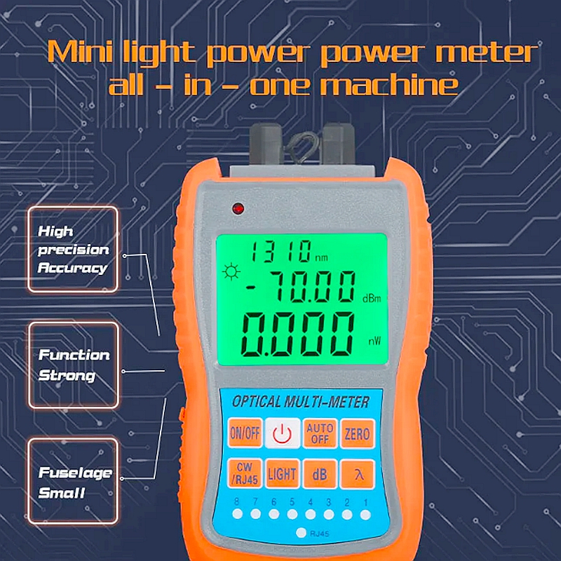 Optical power meter with visual fault locator is a handheld device designed for testing fiber optic cables up to 30 km (18.6 mi). It combines four functions into one compact unit with a durable exterior for field use.